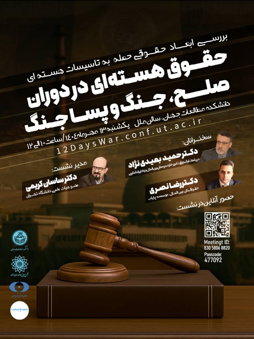 پیش نشست همایش بین المللی خرد و اقتدار ایرانی در جنگ دوازده روزه با عنوان «بررسی ابعاد حقوقی حمله به تاسیسات هسته ای؛ حقوق هسته ای در دوران صلح، جنگ و پساجنگ» به کوشش انجمن ایرانی مطالعات جهان به صورت حضوری و مجازی برگزار می شود.